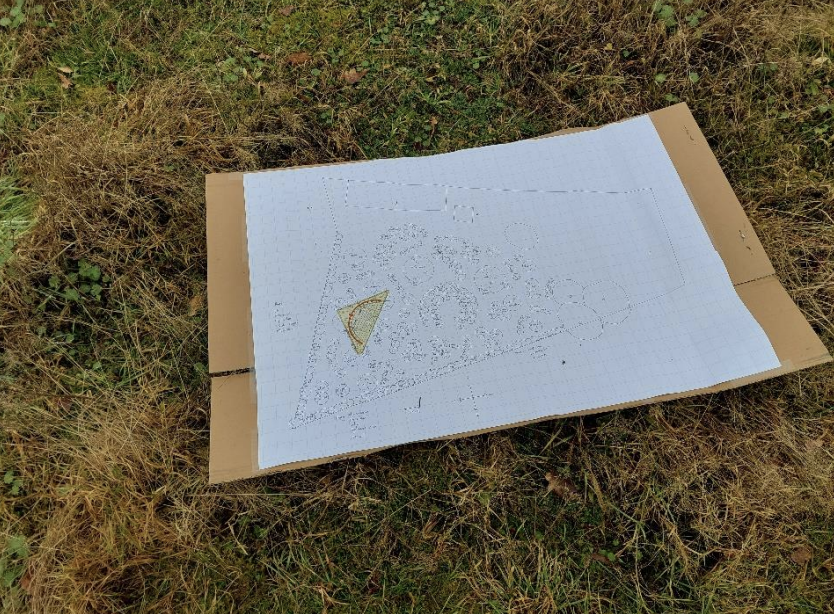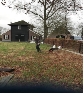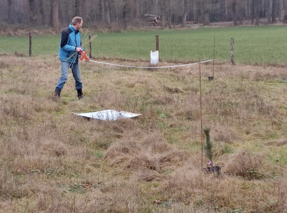 De volgende stap was goed meten en met paaltjes aangeven waar welke boom of struik geplant moet worden conform het gemaakte ontwerp.