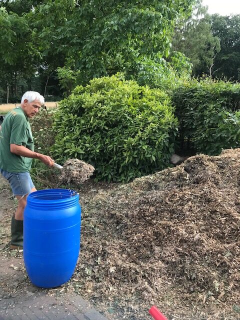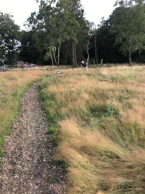 Na het snoeien van een aantal (te) grote bomen op het erf, hebben we met de houtsnippers een pad in het voedselbos aangelegd. Het hout vergaat en levert daarmee voedingsstoffen voor de bodem op. Het pad hebben we eind juli aangelegd en op de meest rechtse foto (gemaakt op 13 september) kan je zien hoe snel de houtsnippers weer overwoekerd worden.
