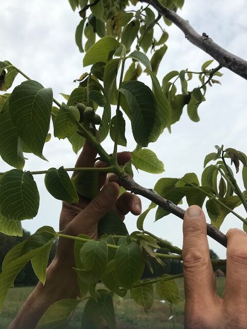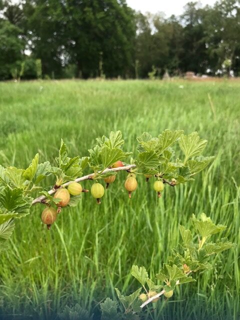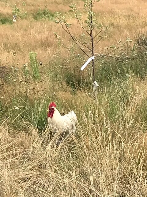 Aan sommige struiken kwamen al bessen. Helaas zijn de vooral opgegeten door een scharrelhaan die aan is komen lopen en sinds enkele maanden op ons erf verblijft. Voor de winter zullen we een goed tehuis voor deze haan moeten zoeken.
